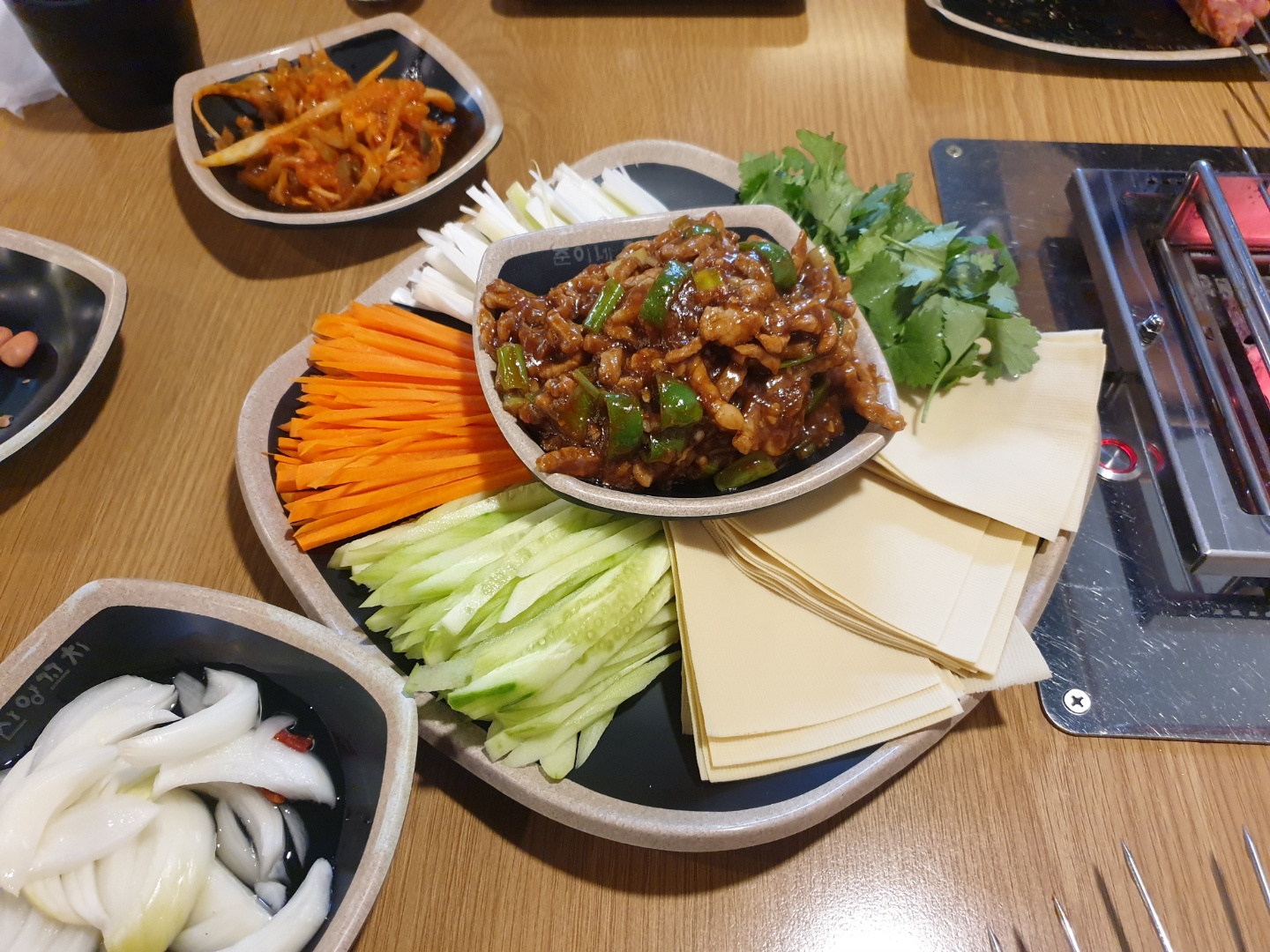 양꼬치를 먹다가 경장육슬을 주문했다. 16,000원이으로 기억한다. 얇은 두부에 고기와 여러 채소를 싸서 먹는 음식인데 맛이 좋았다. 고수를 리필할 수 있다.