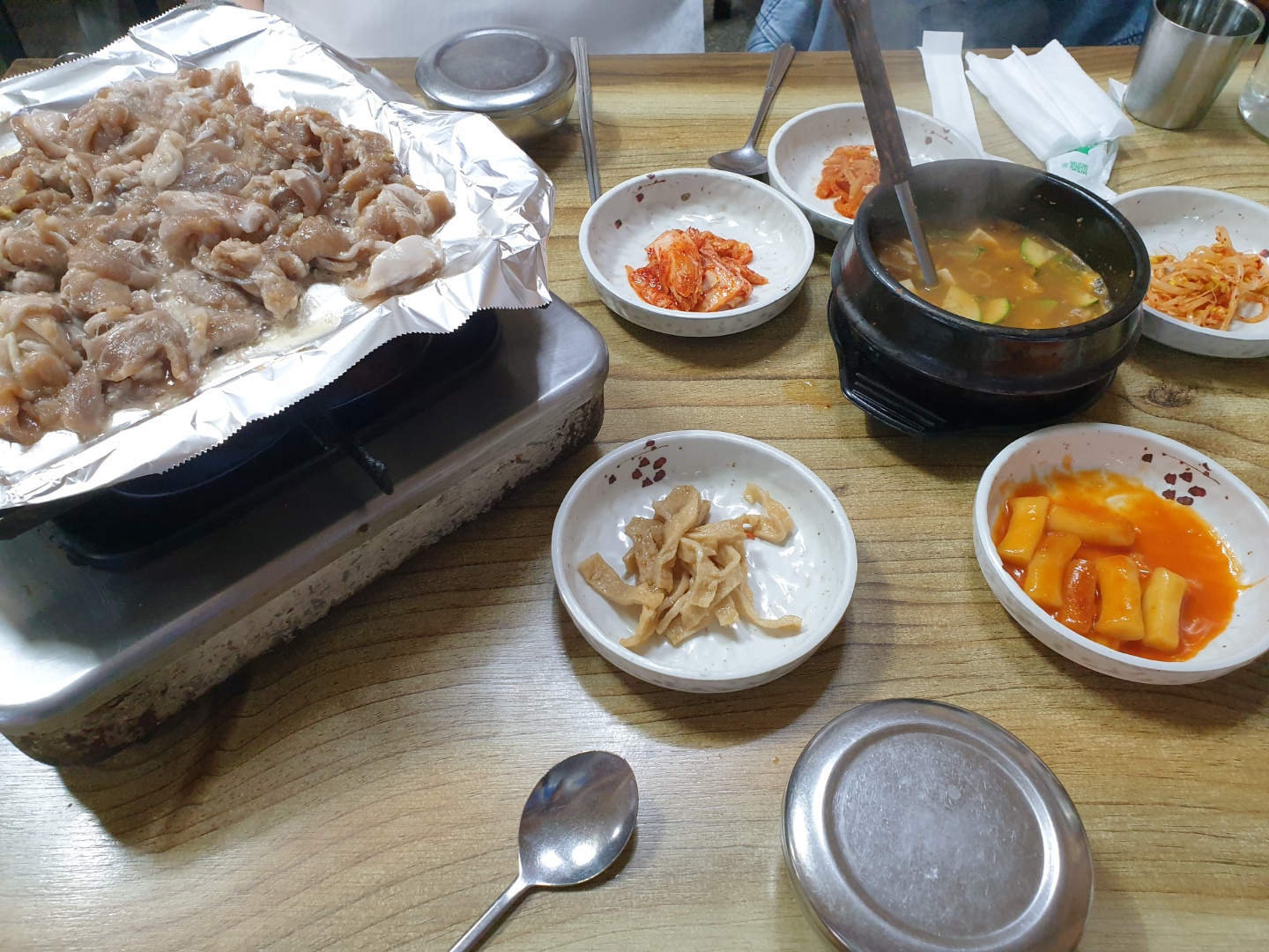 테이블마다 두꺼운 불판이 놓여있었고, 먼저 오신 손님들께서 불판 위에 올린 불고기를 먹고 있었다. 처음에 인당 9,000원인 소불고기를 2인분 주문했는데 갑자기 불판을 치우시길래 식당 이모님께 다른 사람들이 불판에 먹는 메뉴가 뭔지 여쭤보니 돼지불백이라고 말씀하셨다. 그래서 인당 7,000원짜리 돼지불백으로 메뉴를 바꿨다. 여러 밑반찬과 된장찌개가 기본 반찬으로 나온다. 된장찌개는 한 번 더 요청해서 먹었고 콩나물무침은 접시가 비워질 때마다 가져다주셔서 세 번이나 더 먹을 수 있었다. 전날 술을 마셨지만 음식의 구성을 보니 도저히 참을 수 없어서 소주도 한 병 시켰다. 소주도 한 병당 3,000원으로 저렴했다. 조금 진지한 이야기를 나누다가 식당이 금방 만석이 되어서 자리를 정리하고 나왔다.