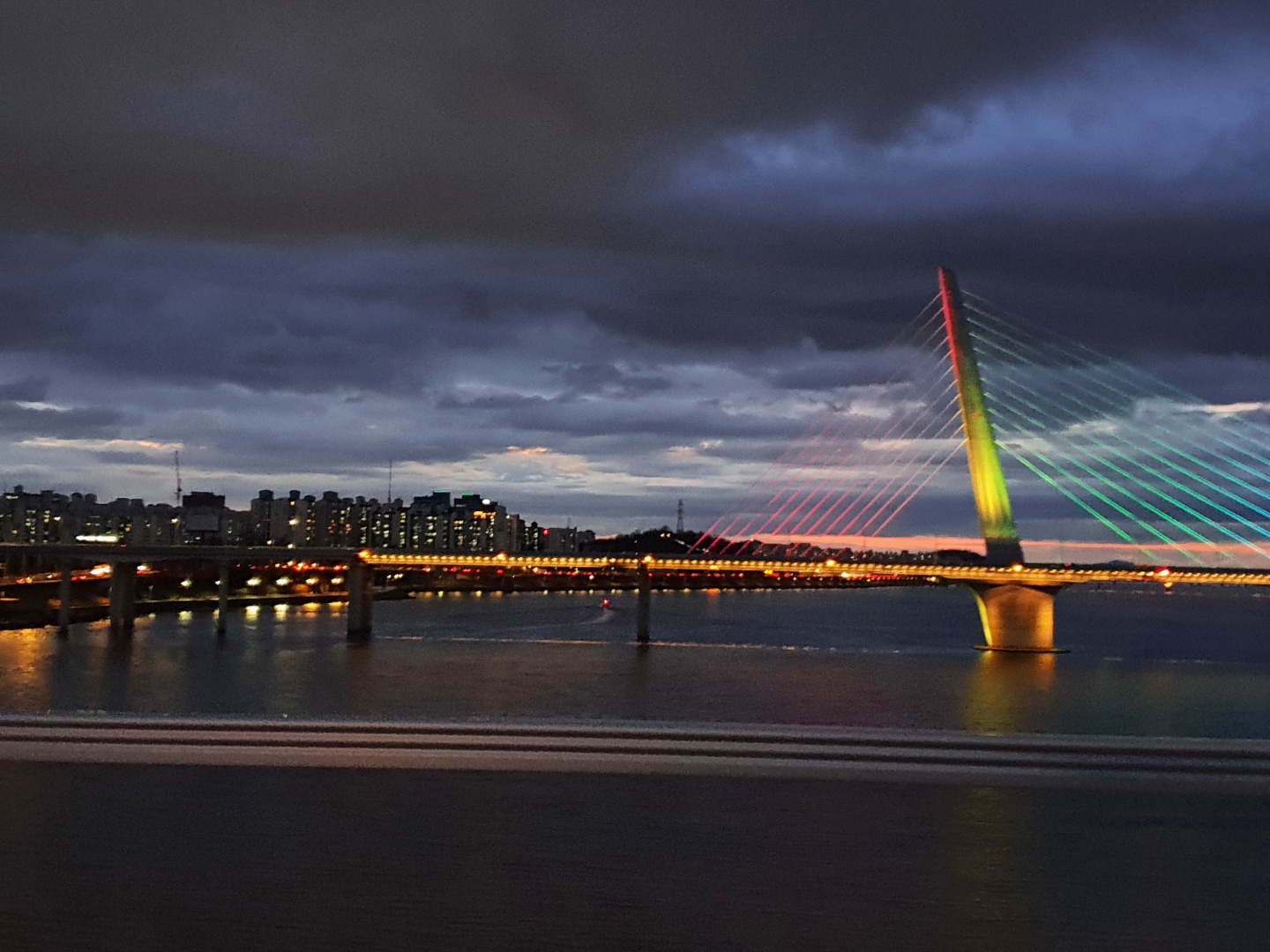 서울로 돌아오니 해가 지고 있었습니다. 길을 잘못 들어 성산 대교를 건너게 되었습니다. 저는 구름 낀 날의 노을을 좋아합니다. 지평선 가까이에서 해의 흔적을 볼 수 있기 때문입니다. 월드컵 대교의 조명이 찬란했습니다. 어쩌면 잘못 든 길에 본 다리의 조명 때문에 이날의 기억이 유독 강하게 남았는지도 모르겠습니다.