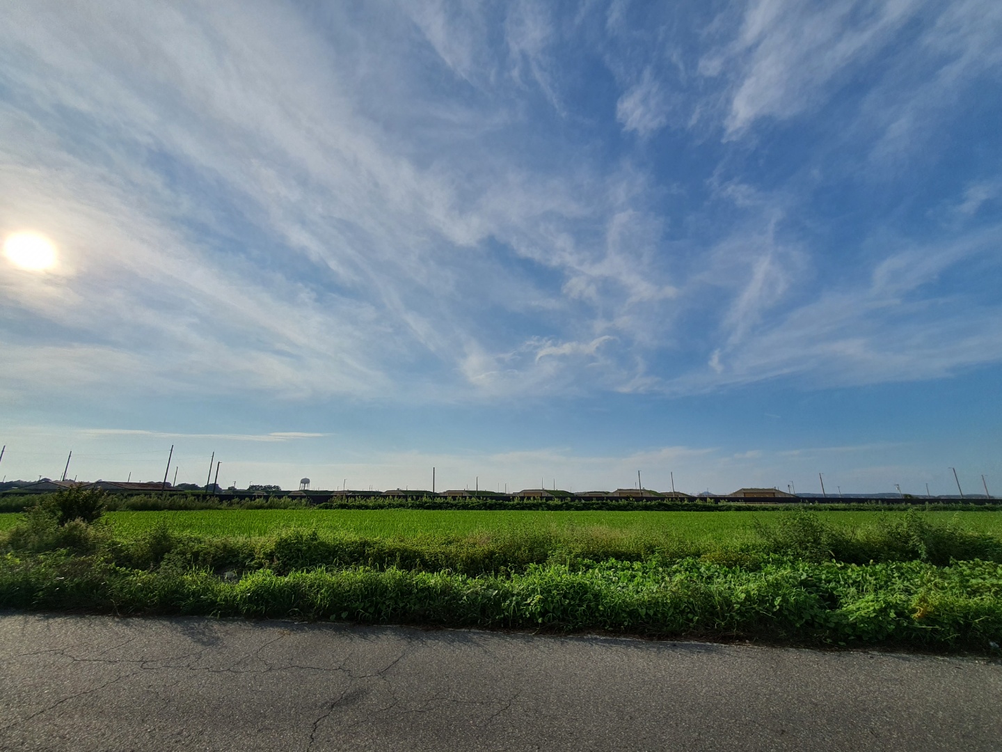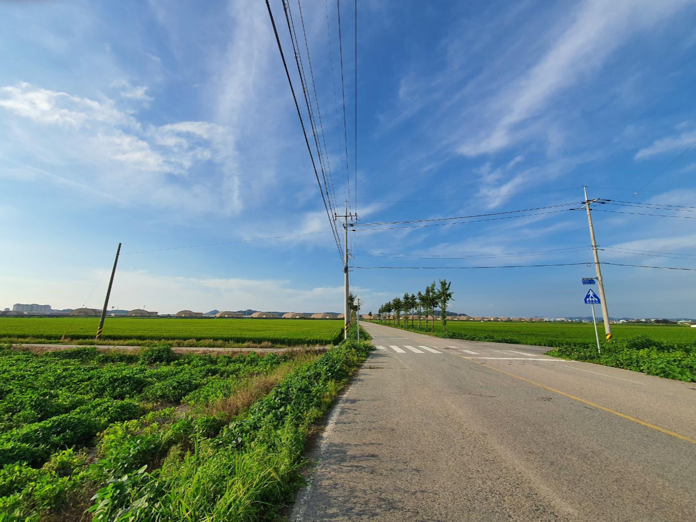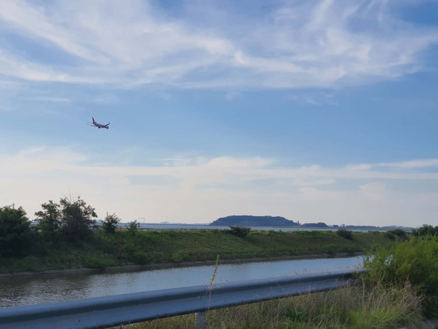 만경강을 따라 난 도로가 끝나는 구간에는 차량 캠핑을 즐기는 두 가족이 있었습니다. 부모들은 느긋해 보였고 아이들은 행복해 보였습니다. 공사 중인 흙길을 따라 잠깐 강변에 내려갔다가 다시 하제포구로 유명한 하제 방향으로 갔습니다. 북쪽의 하제까지 가는 올곧은 도로는 군산공항에 착륙하는 비행기의 궤적과 나란합니다. 이 비행기는 아마도 제주도에서 오는 비행기일 것입니다. 비행기 착륙 시간이 맞는다면 비행기와 함께 달리는 독특한 경험을 할 수 있습니다.
