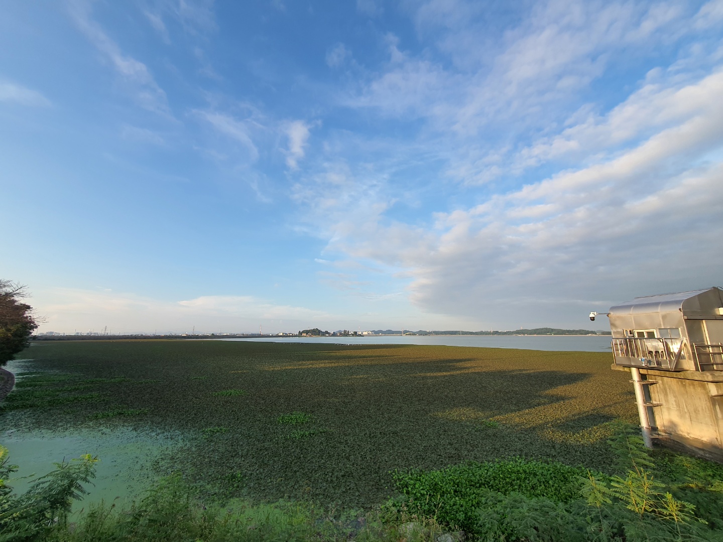 물을 빼내는 배수문이 군데군데 있어 여유롭게 휴식을 취하기에 알맞습니다. 거대한 콘크리트 구조물이 그늘을 만들고 의자도 잘 구비된 편입니다. 저는 규모가 큰 제2 배수문에서 휴식을 취했습니다. 제2 배수문은 관광 시설을 염두에 두고 만들었기 때문에 전망대와 경사로가 잘 갖춰져 있습니다. 이곳의 전망대는 근처에 산이나 언덕이 전혀 없기 때문에 높은 곳에서 조망할 수 있는 유일한 시설이기도 합니다. 현재 시설은 전혀 운영하지 않는 상태입니다. 2층까지 자전거를 끌고 올라가 전망대가 드리운 그림자 아래에 있는 나무 계단에서 준비해 온 음식과 과일을 먹었습니다.