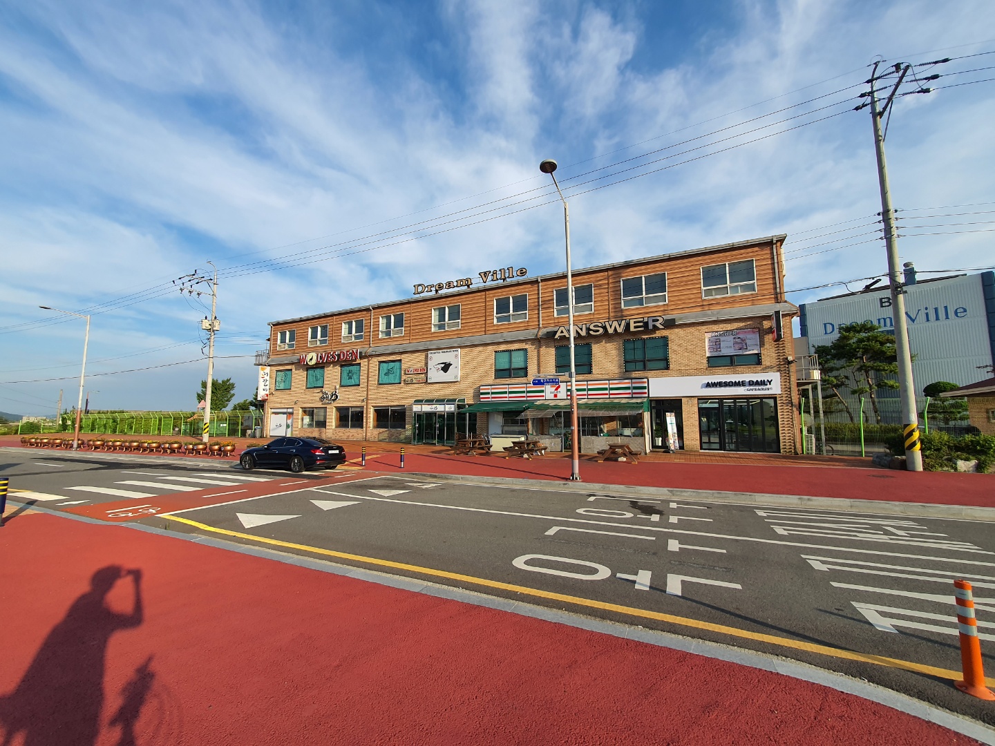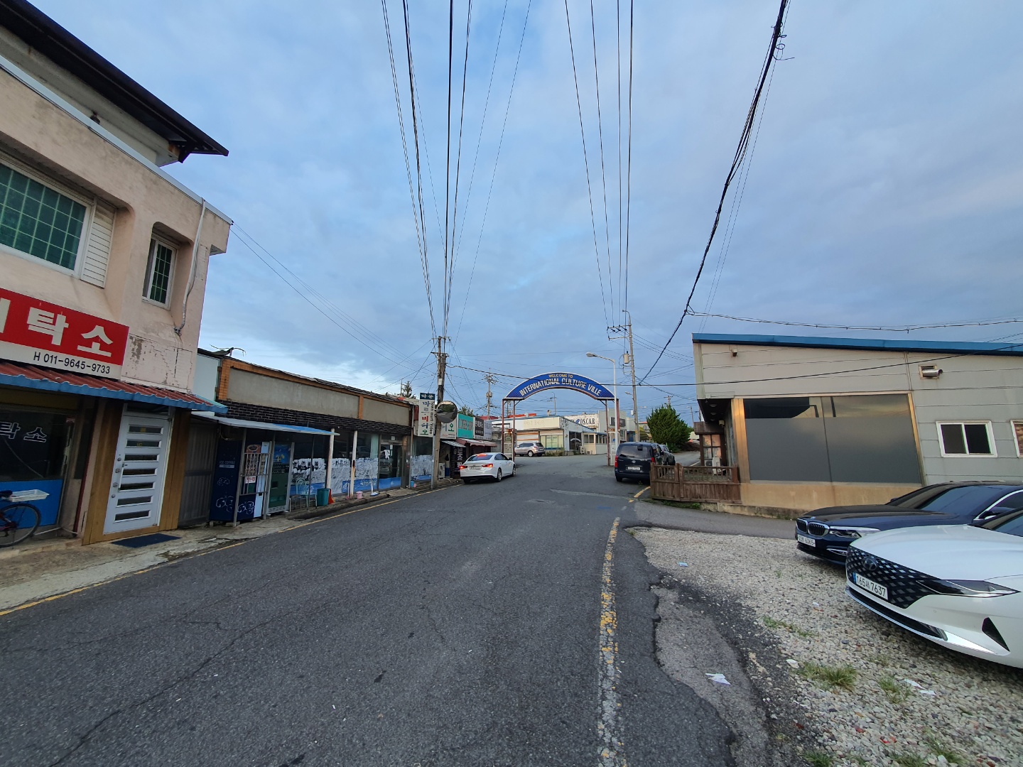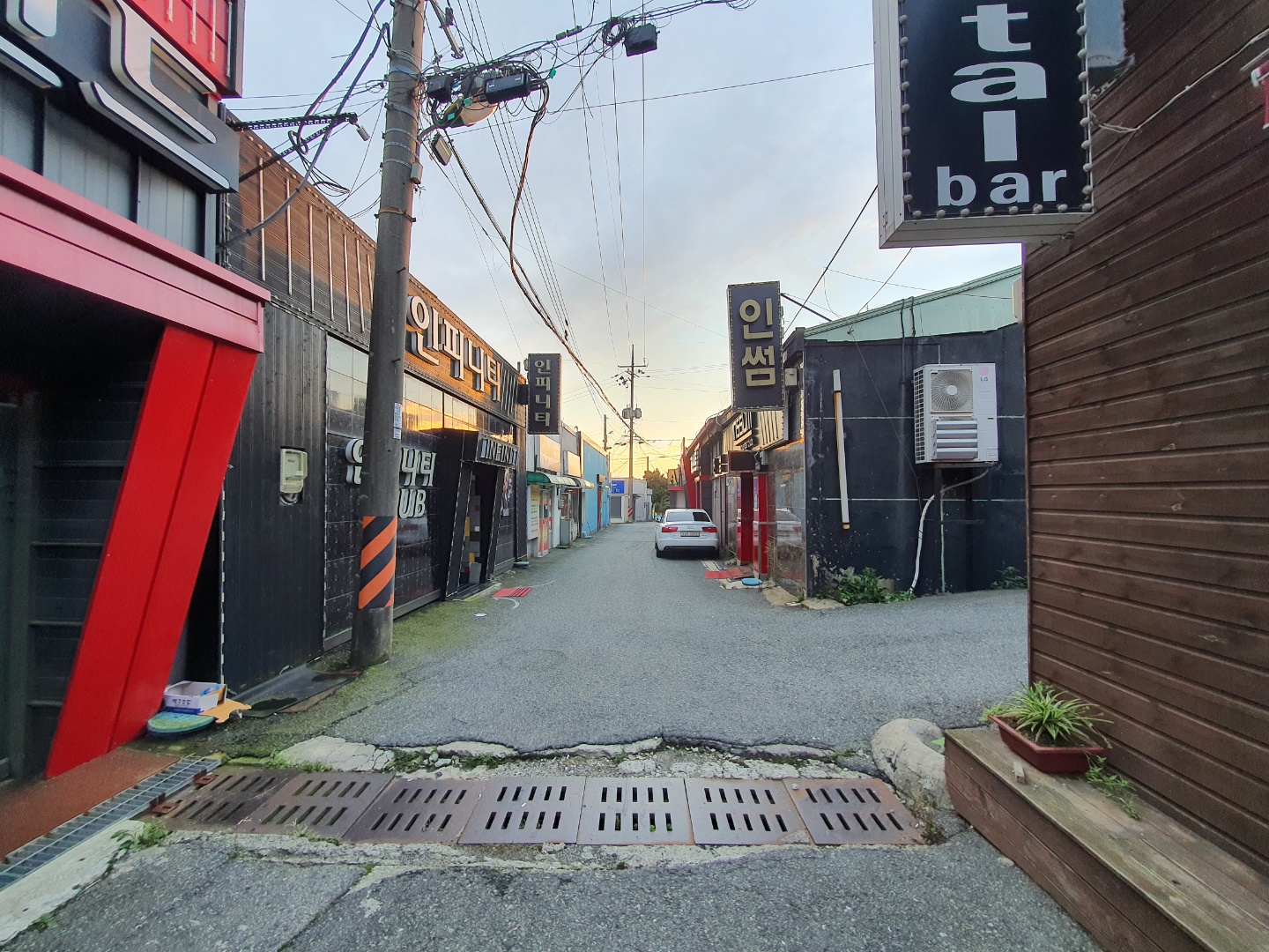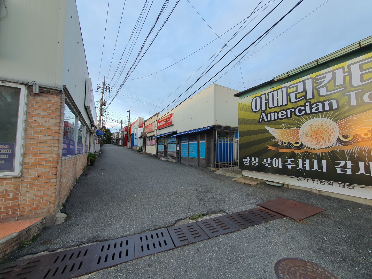 기지의 정문까지 가면 편의점과 식당이 있는 마을이 나옵니다. 편의점에 들러 탄산음료 두 캔을 사서 마셨습니다. 기지 근처의 가게는 한국어 간판보다 영어 간판을 훨씬 많이 볼 수 있었습니다. 주한 미군의 영외 거주 시설도 볼 수 있었습니다. 부대 앞에는 몇 개의 부대찌개 식당이 있습니다.