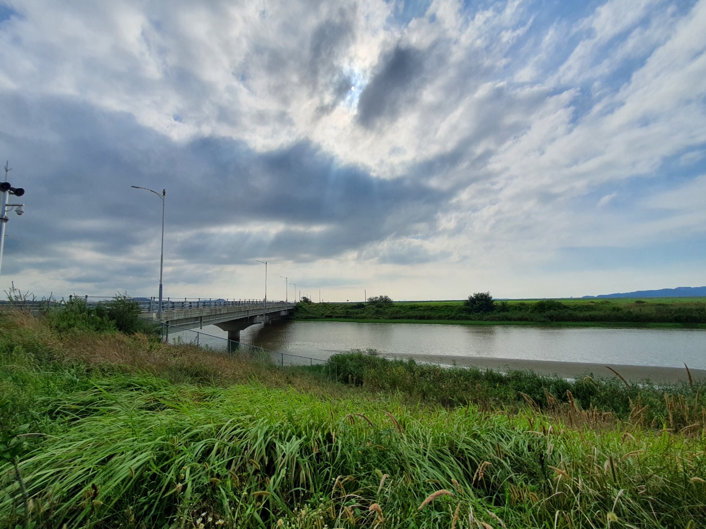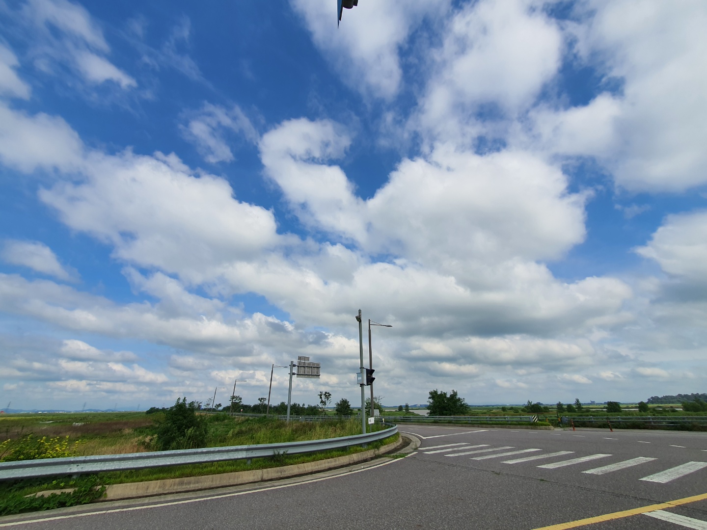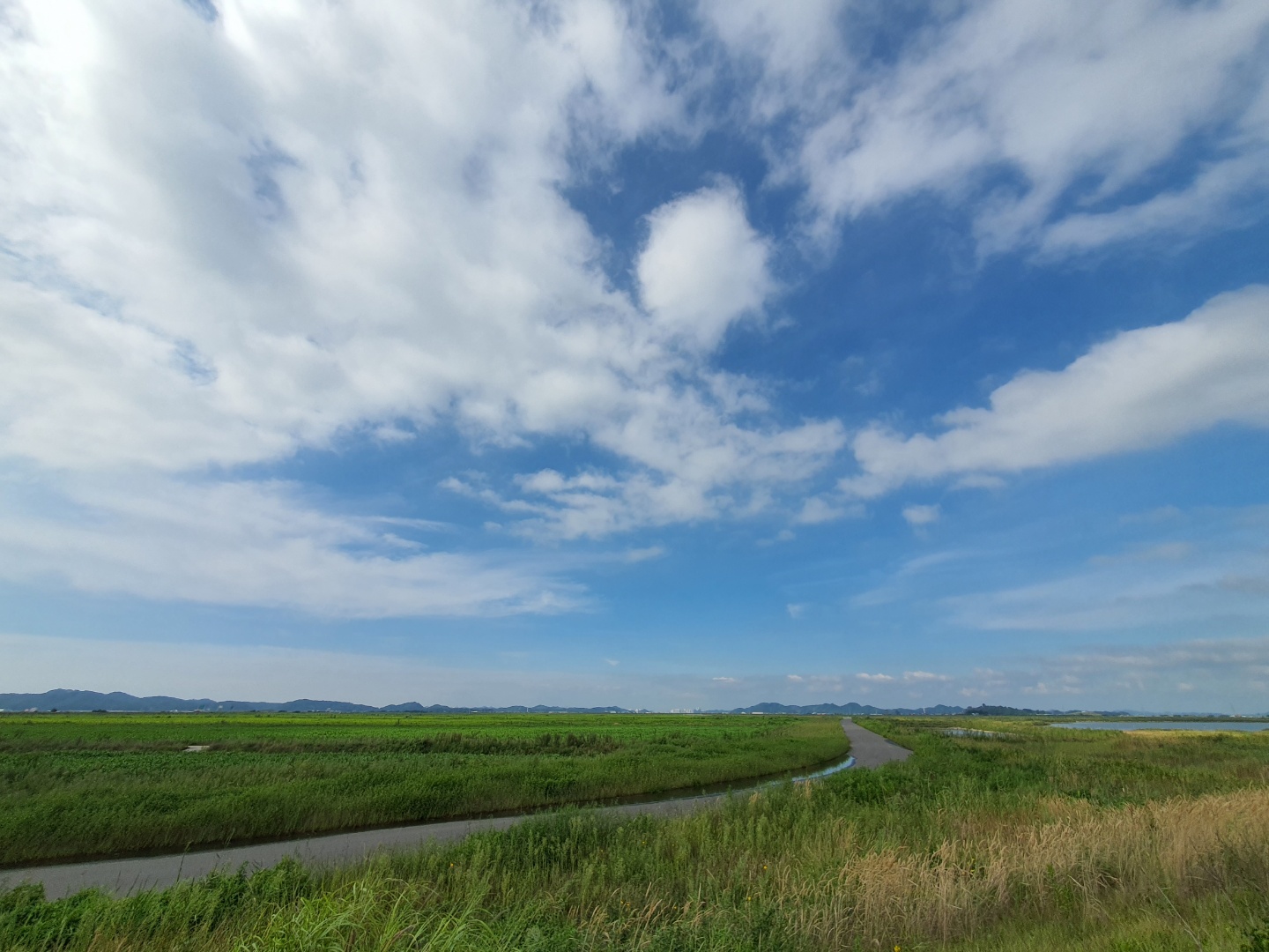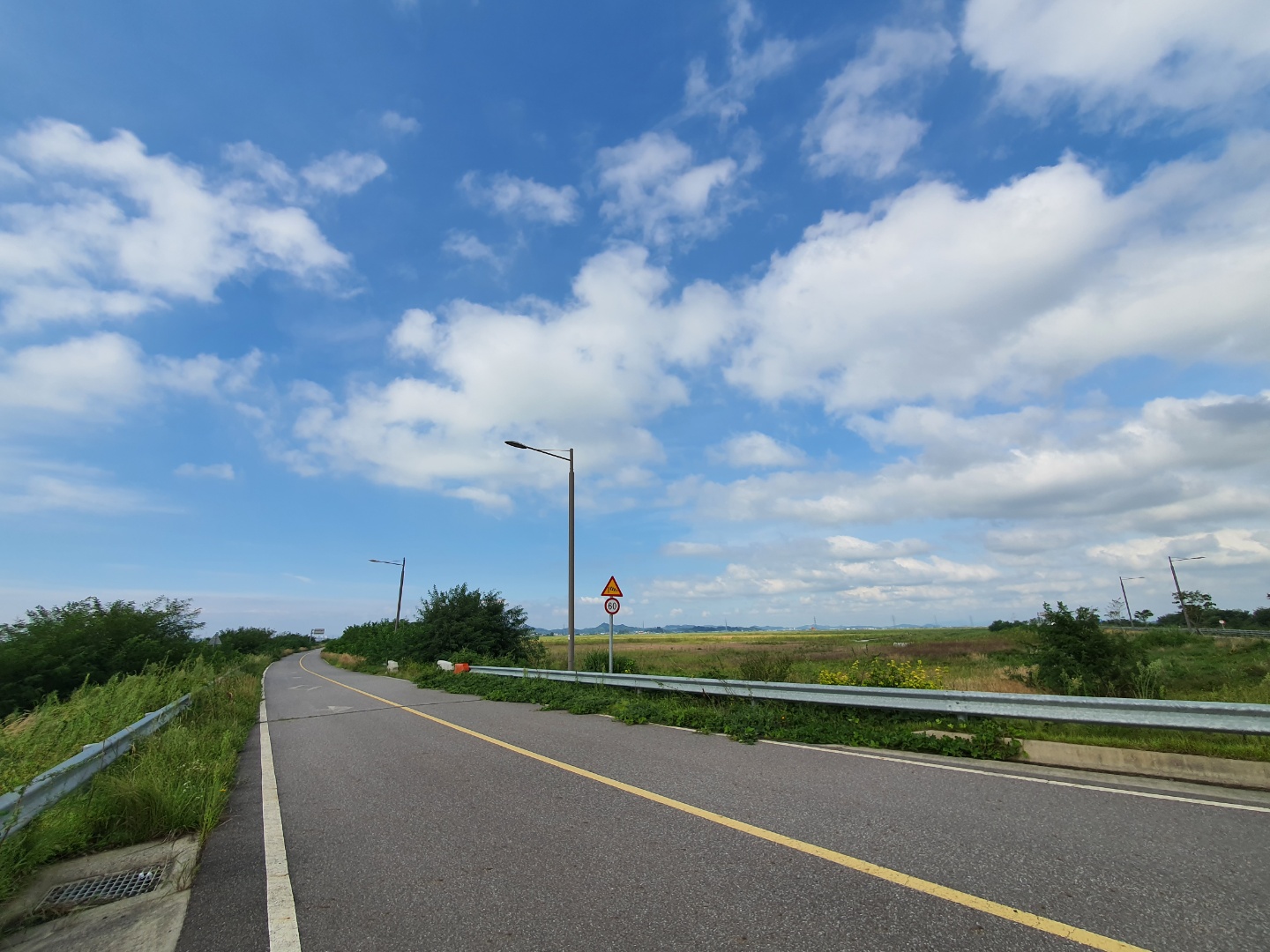 간척이 완전히 끝난 구역이 아니라서 이 구간의 자전거 도로는 관리가 잘 이루어지지 않은 상태입니다. 아직 도로가 개통되지 않은 상태이기에 차량이 없는 도로를 따라 달렸습니다. 하제에서 도로가 끝날 때까지 만경강을 따라 난 10km의 구간은 경사가 전혀 없으면서 동시에 지평선과 수평선을 동시에 볼 수 있는 도로입니다. 긴 구간을 달리는 동안 사람이나 차량의 소리는 전혀 들리지 않습니다. 아주 가끔씩 자전거를 타는 사람만 마주칠 수 있을 뿐입니다. 구름이 약간 낀 날씨임에도 햇볕이 굉장히 강하기 때문에 고글과 버프가 필요합니다. 오후의 공기가 많이 뜨겁지만 불쾌하기보다는 계절이 끝나감에 아쉬울 따름입니다. 강바람을 맞는 동안 이런저런 생각을 하면서 천천히 달렸습니다.