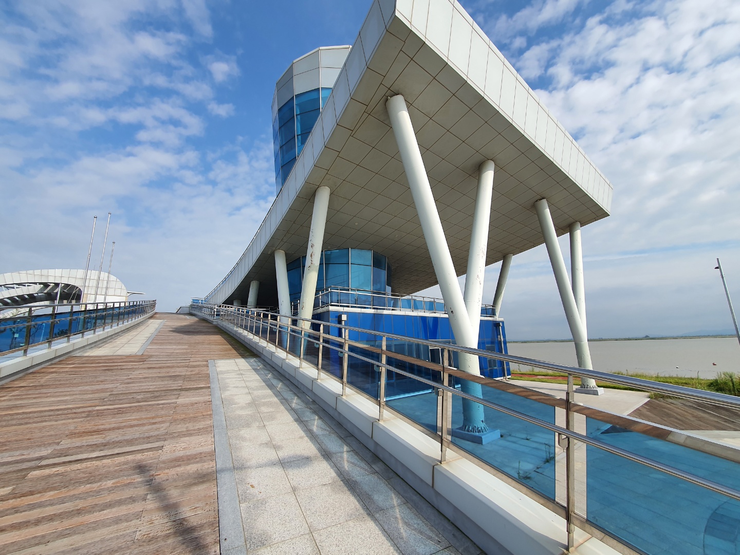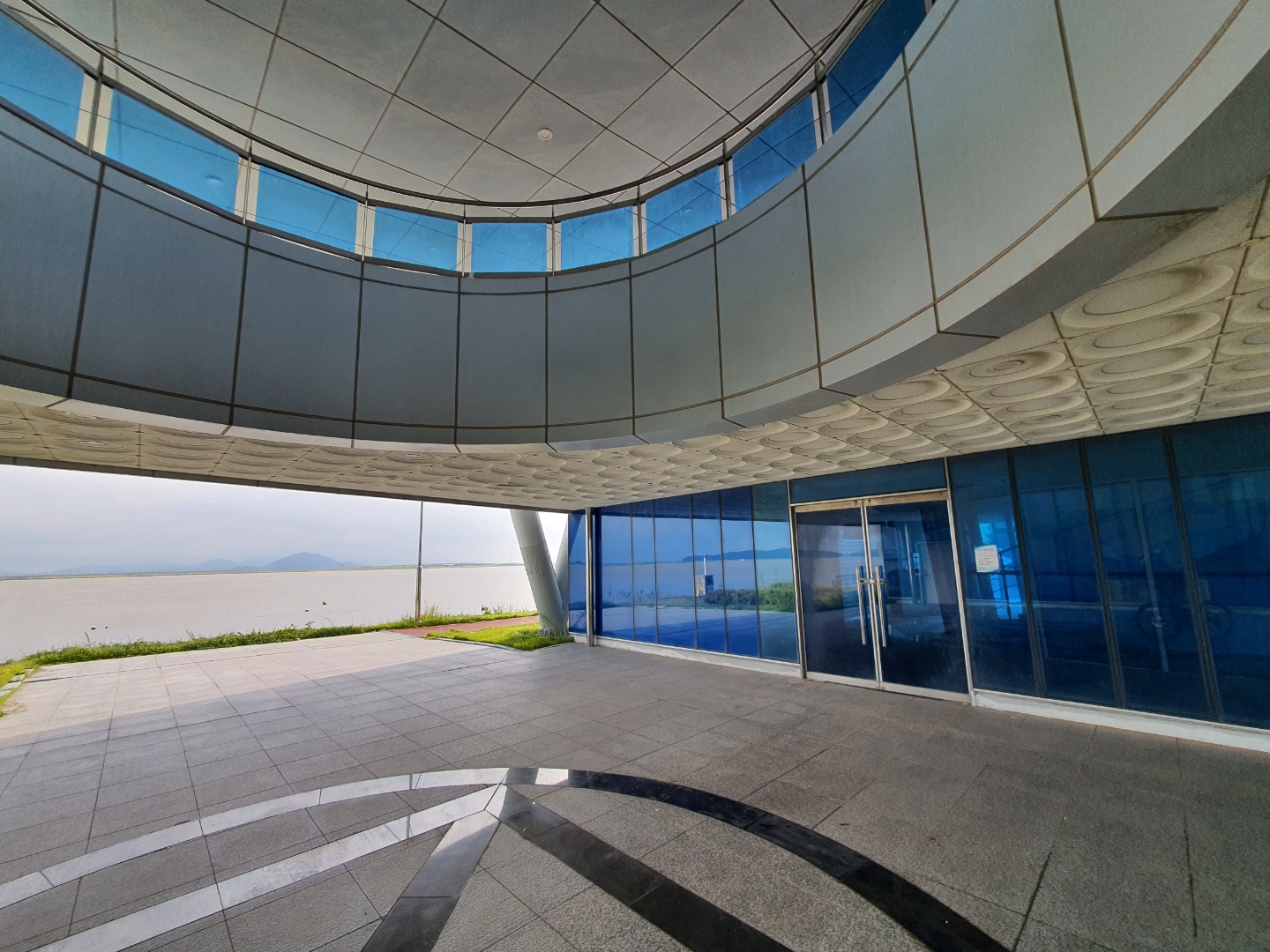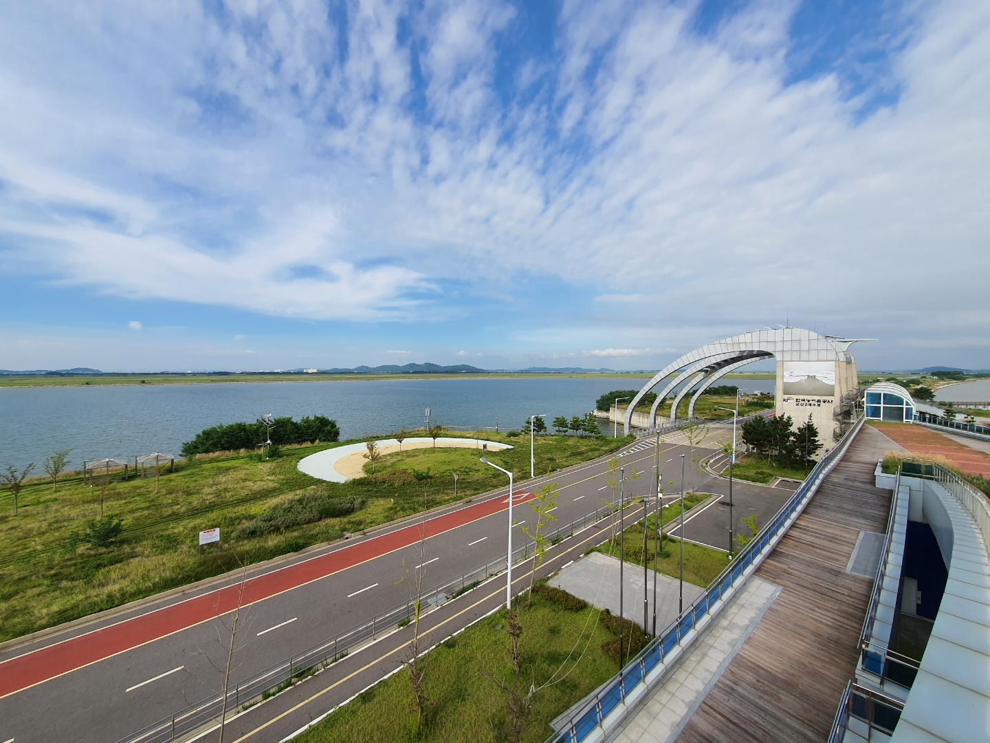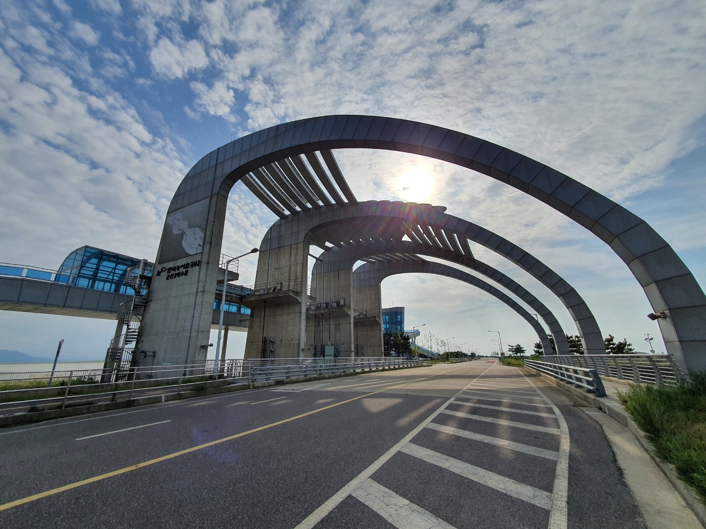 전망대에서는 새만금 안쪽에 있는 다리인 커다란 만경대교가 보입니다. 리버스 아치교로 설계되었다고 하는데 하늘을 향해 그리는 거대한 호와 같은 구조물이 독특합니다. 저는 제2 배수문 2층에서 꽤 오랜 시간을 머물렀습니다. 커피를 가져왔으면 더 좋았겠습니다. 사진을 찍고 생각을 하는 동안 딱 한 명의 사람만 볼 수 있었습니다. 이 정도까지 사람이 없는 곳은 아니었는데 아마도 더운 날씨 탓에 사람들이 많이 오지 않은 것 같습니다.