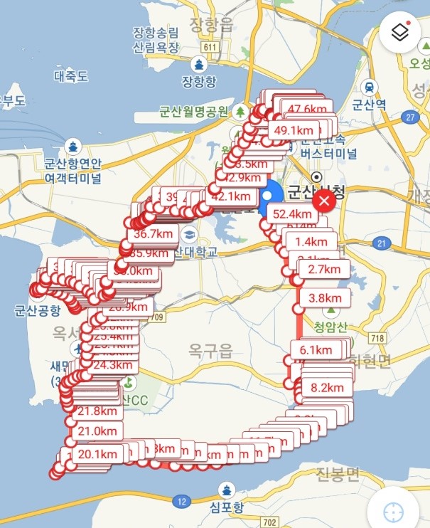 이날 탄 구간은 약 52km 정도의 길이입니다. 자전거 도로로만 다닌 것이 아니라 구시가지를 많이 돌아다녀서 자전거를 타기에 썩 좋은 코스는 아니었습니다. 만경강 부근의 코스는 미군 부대 근처로 가기 전까지 가게는커녕 민가조차 없는 간척지이기 때문에 미리 마실 것을 준비해야 합니다. 차량 통행이 많은 지역은 아니지만 개중에는 차도만 있는 길도 포함하고 있습니다.