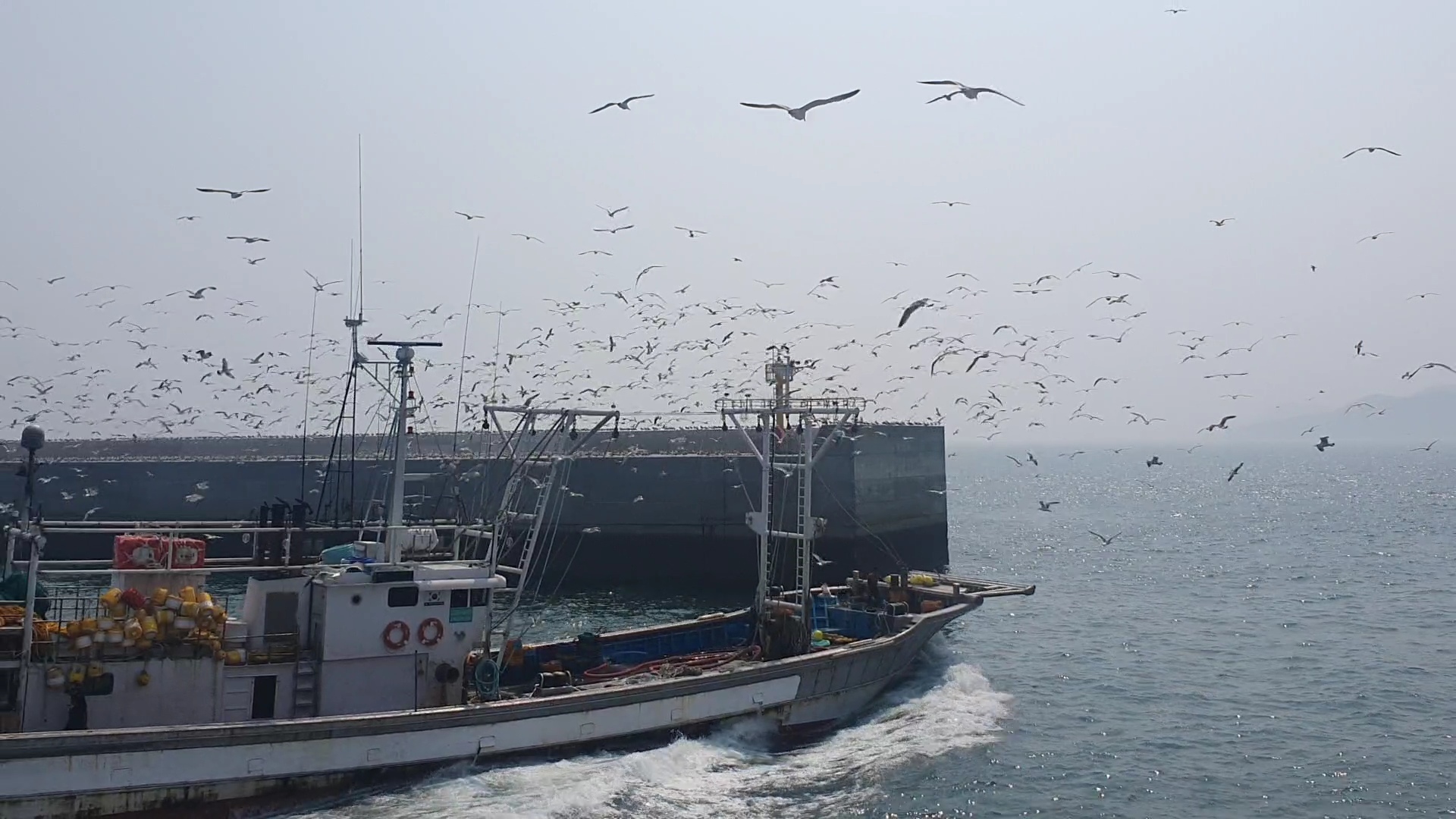 방파제 끝에서 저는 어마어마한 갈매기 떼를 만났습니다.