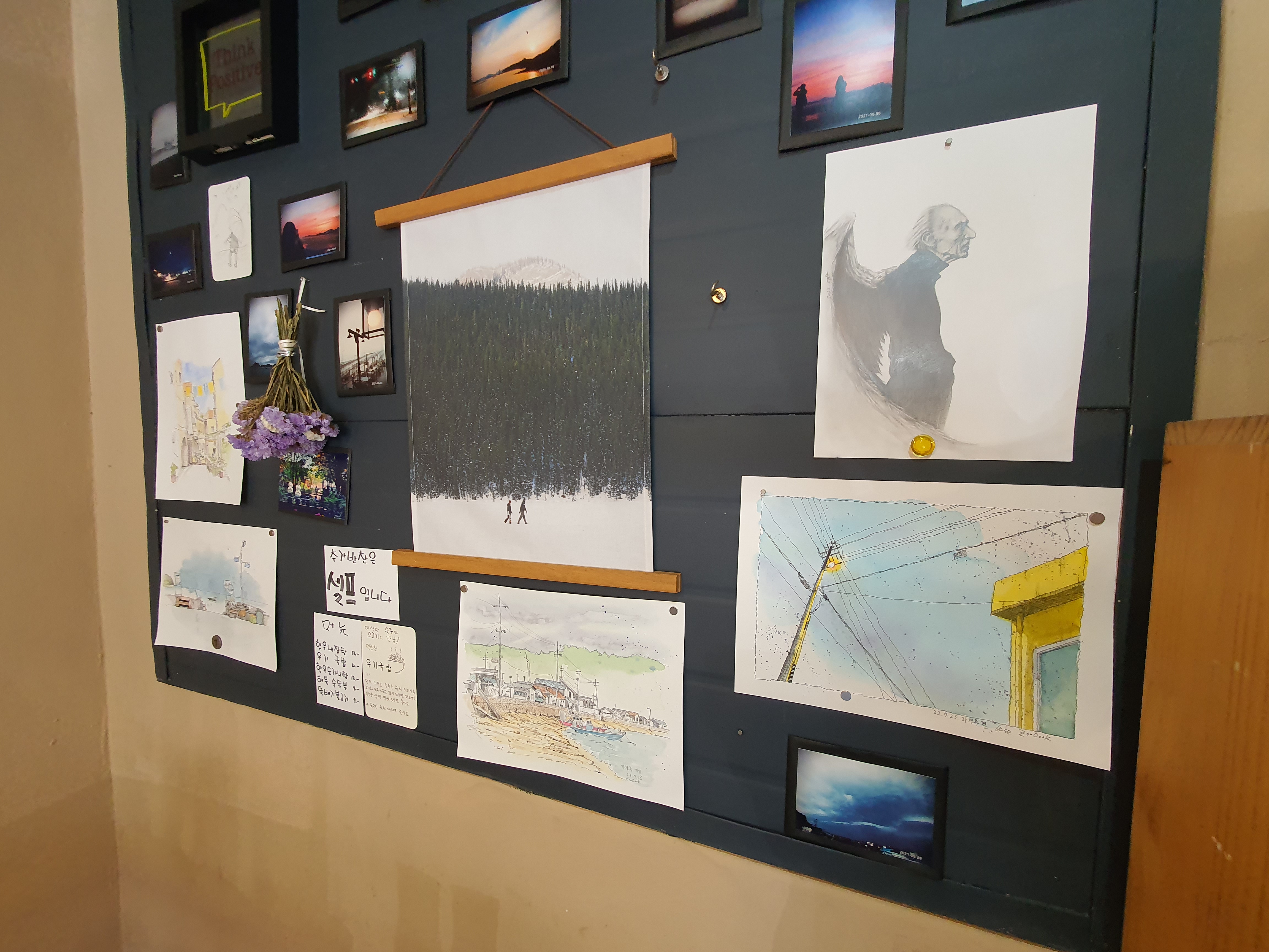 벽에는 멋진 스케치들이 있어요.