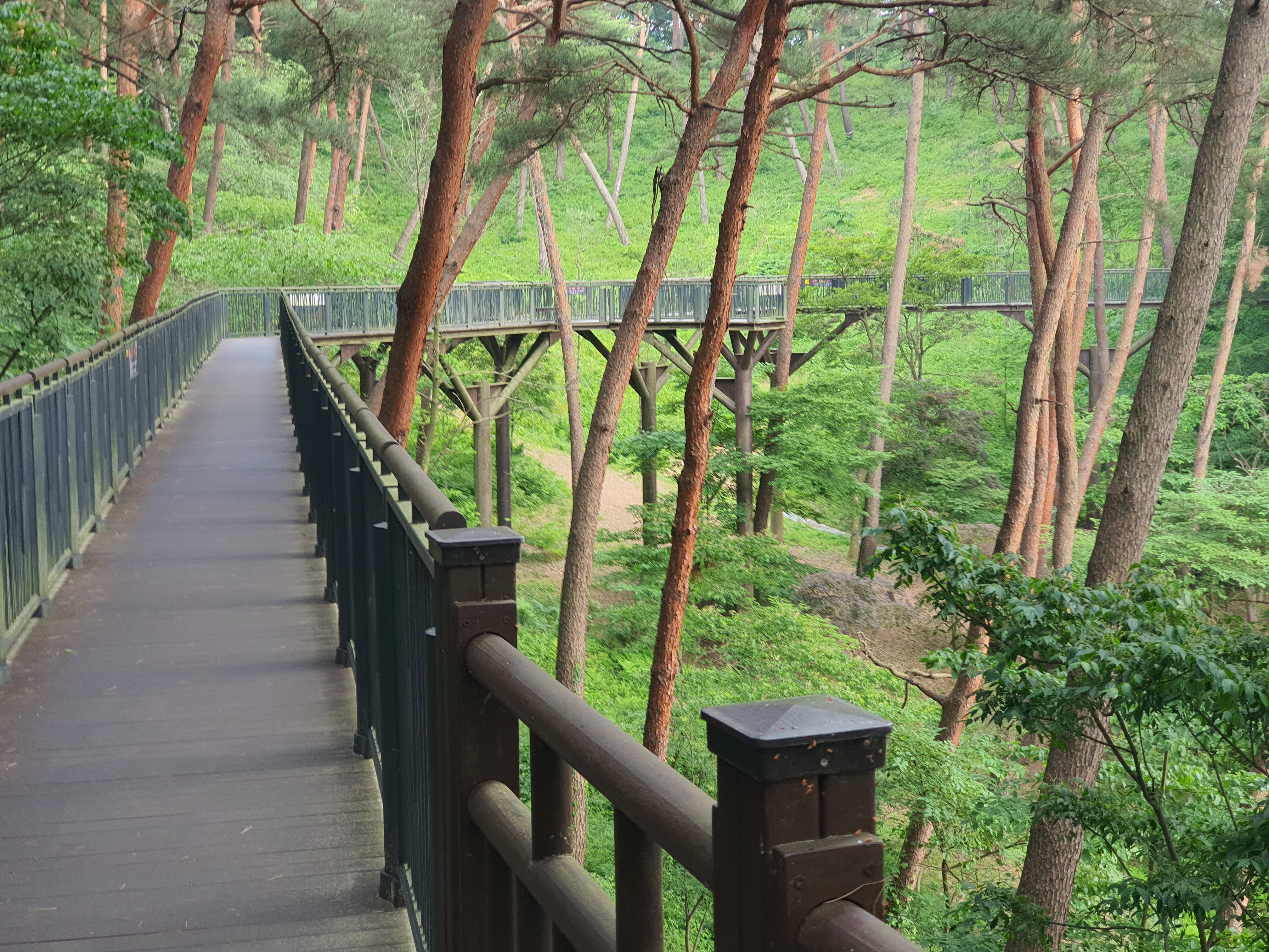 휴양림에는 전체적으로 완만한 나무 데크가 깔려 있어 급격한 경사를 오르지 않고도 높은 장소에서 멋진 소나무 숲을 즐길 수 있습니다.
