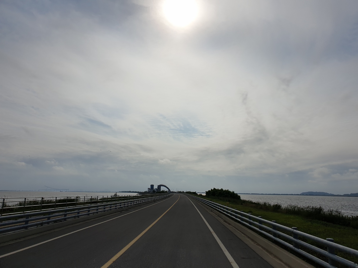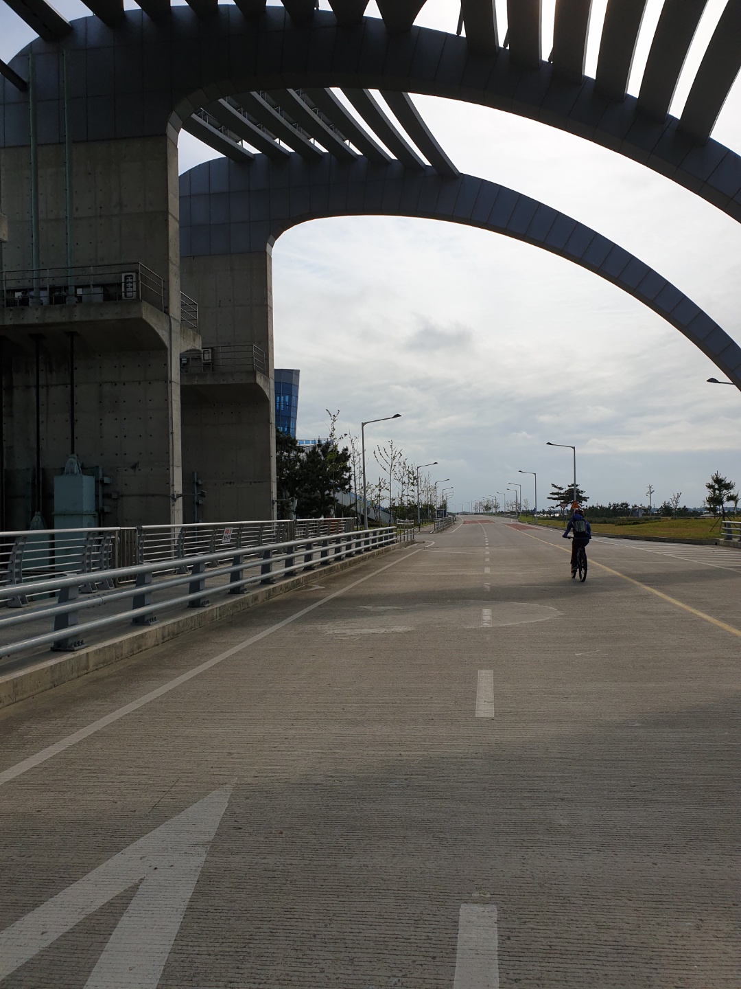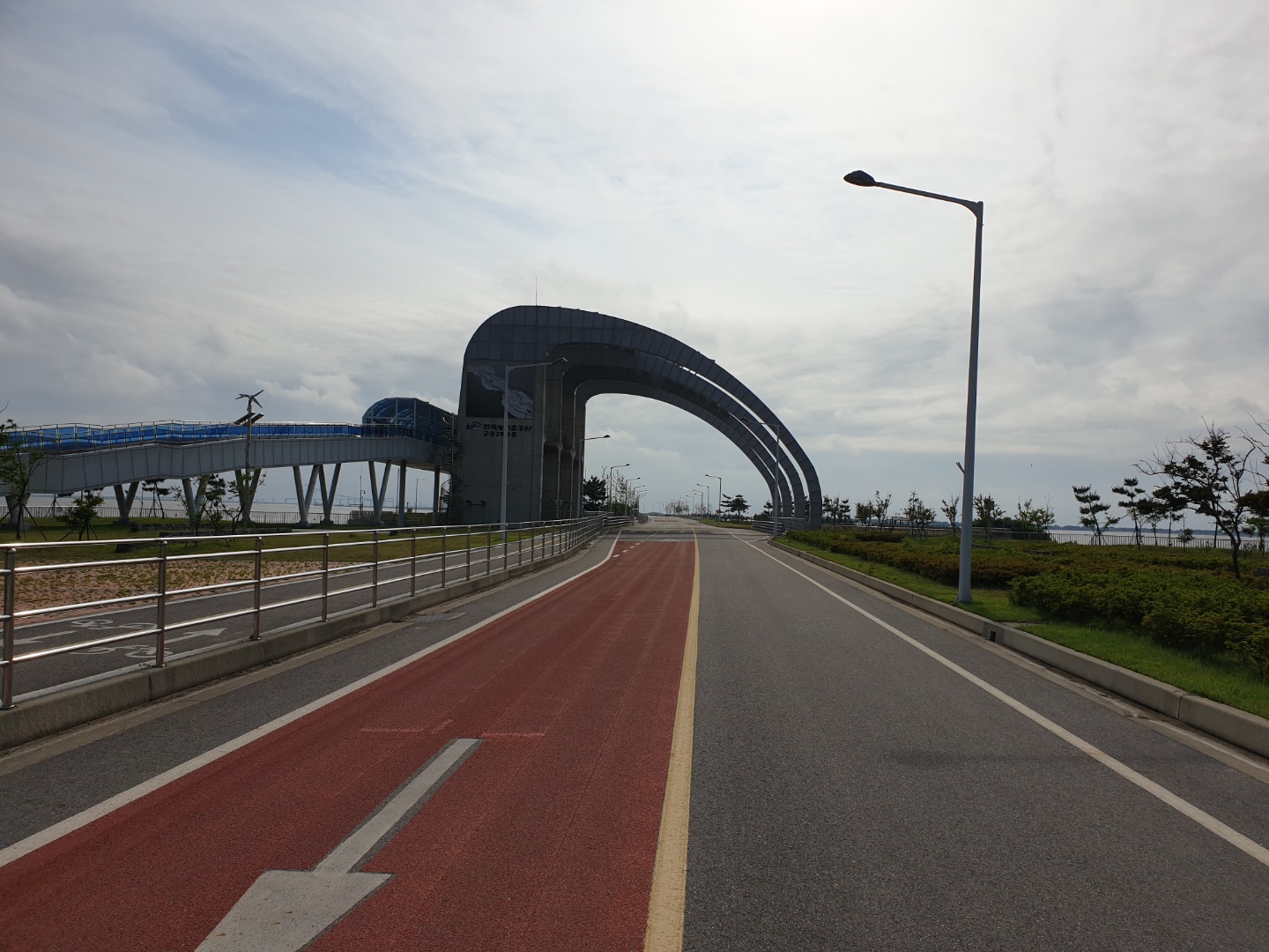 자전거 도로를 따라 달리면 가끔씩 배수문이 보인다. 거대한 물줄기가 쏟아지는 신시배수갑문의 관광지적인 분위기와는다른 고독함이 있다. 그것은 시간과 하늘에 대한 고독함이다. 거대한 콘크리트 구조물로 장식된 배수문은 낯선 이곳의 분위기를 더욱 낯설게 만든다. 현대적인 투박함을 가진 구조물의 표면은 내가 새만금을 기억하는 또다른 방식이 되었다. 지금은 물을 가르며 나아가는 형상의 이 도로의 한쪽 물은 모두 배수문을 통해 빠질 것이다.