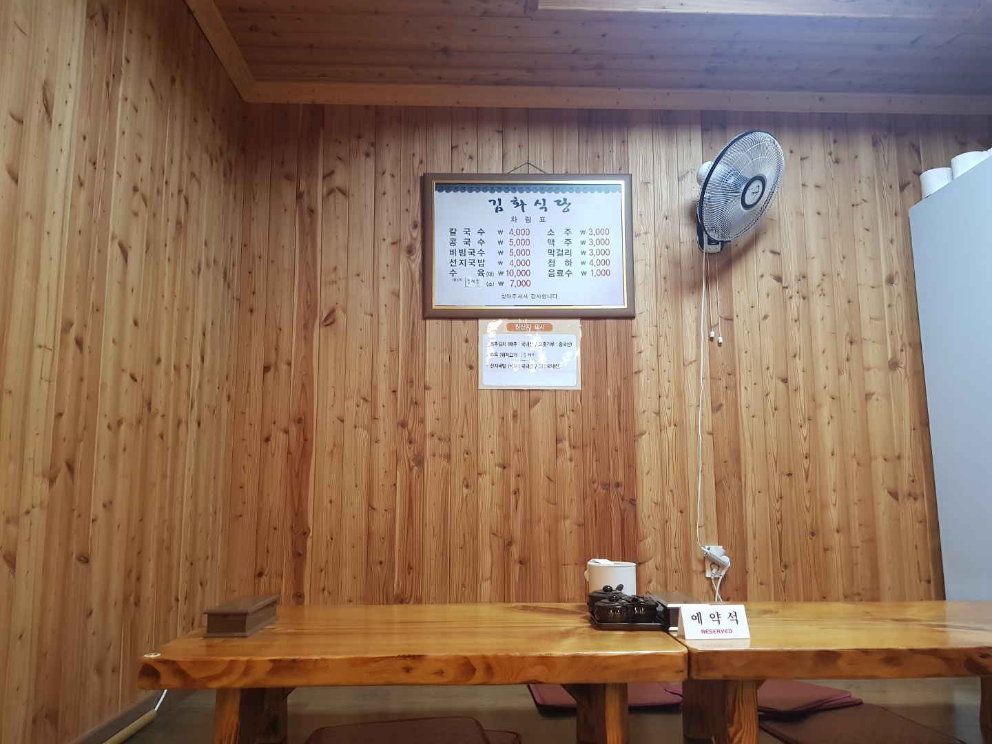 금속제 간판이 달린 김화칼국수의 외관은 국숫집보다는 마치 오래된 고깃집을 연상시켰다. 가게는 있는 자리는 모두 신발을 벗는 좌식이었다. 가게를 찾는 손님들의 연령대는 상당히 높은 편이었기 때문에 가게가 견딘 세월을 짐작할 수 있었다. 음식의 가격은 매우 저렴했다. 칼국수는 4,000원, 콩국수와 비빔국수는 5,000원이었다. 칼국수 하나와 콩국수 하나를 주문했다. 일행이 술을 하지 않아 수육은 시키지 않았다.