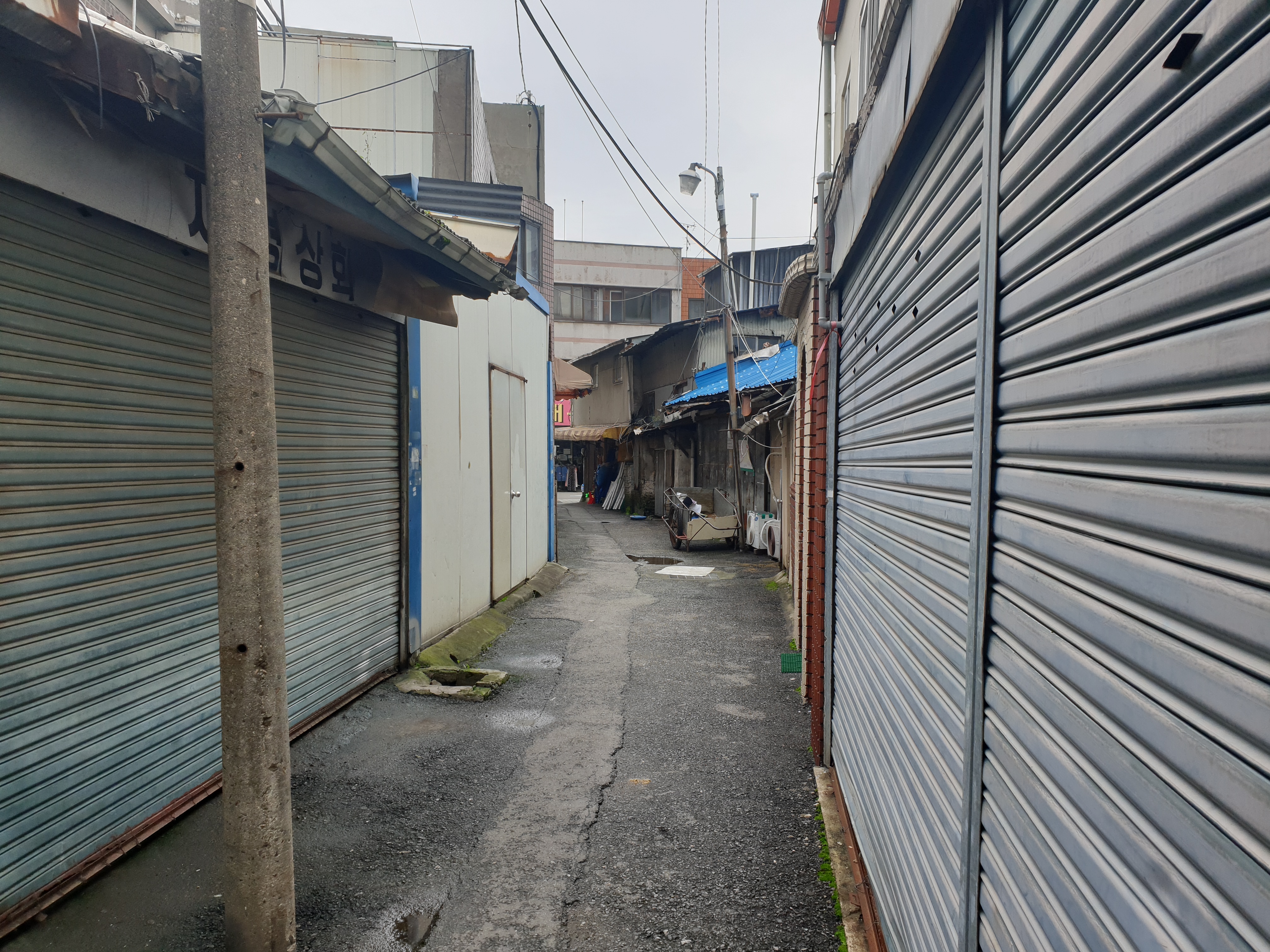 낡은 시멘트 건물들이 앞부분에 속한 역전종합시장 거리이고, 뒤에 보이는 빨간 글씨의 군산공설시장이 새로 건설한 마트형 시장이다. 역전종합시장의 낡은 시멘트와 슬레이트의 표면에서 시간의 무게가 느껴진다. 나는 이곳의 비뚤게 붙은 창틀이 좋다.